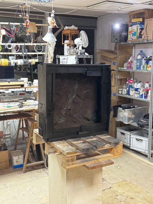 EDEN (2025) terre, LED, matériaux divers - wood, concrete, mixed media 62 x 62 x 26 cm -
